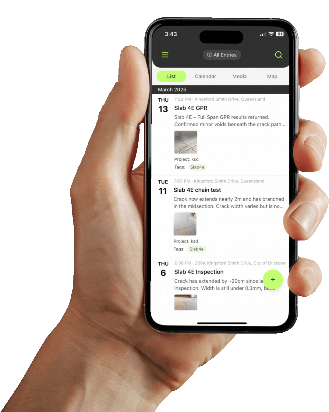 Organise entries by project, tags and location, allowing you to view entries in List, Map, or Media form.